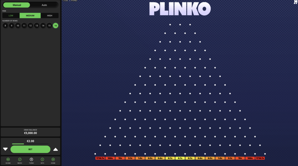 Para cazadores de Jackpots: La única forma de ganar grande es Riesgo Alto / 16 Filas. Ten en cuenta que verás muchos “0.2x” antes de que caiga la bola en el extremo, así que necesitas paciencia y saldo.