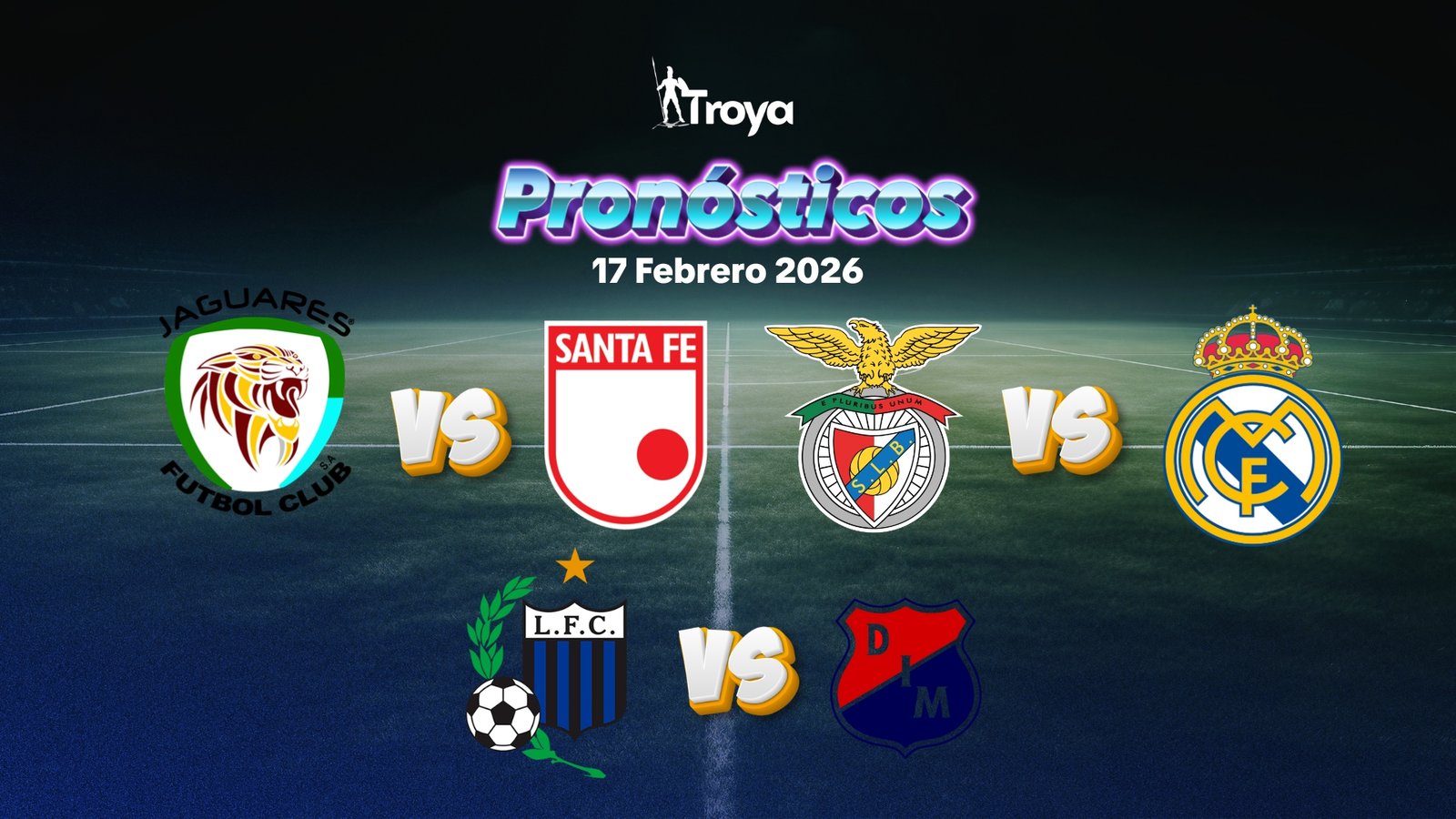 Esta jornada del 17 de febrero trae tres partidos imperdibles que combinan fútbol colombiano, europeo de élite y la Copa Libertadores. Desde Montería con Jaguares vs Santa Fe en la Liga BetPlay, pasando por el duelo de revancha entre Benfica y Real Madrid en Champions League, hasta el debut de Medellín en Libertadores contra Liverpool Montevideo. Aquí te traemos nuestros pronósticos basados en análisis estadístico y forma reciente de los equipos.
