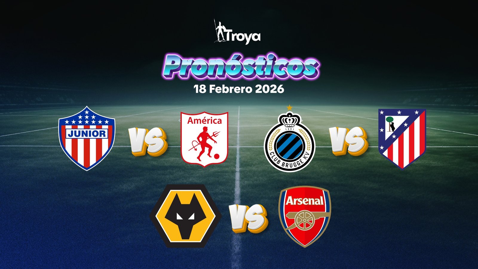 El 18 de febrero de 2026 nos da tres partidos de alto nivel con narrativas distintas: el clásico que para a Colombia con Junior vs América, la batalla táctica de Champions en Bélgica entre Brujas y Atlético, y la diferencia abismal de categoría entre el líder Arsenal y el colista Wolves. Recuerda siempre apostar con responsabilidad y con capital que estés dispuesto a perder.